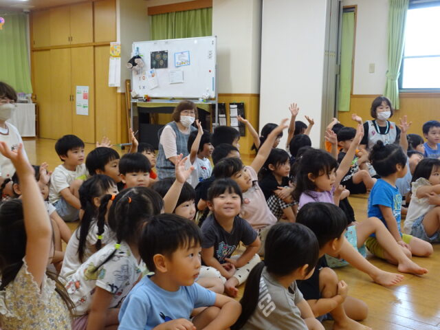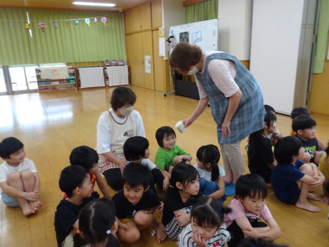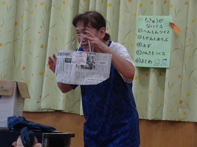 新聞紙で作ったカバンを見せてくださいました。日頃みんなが使っているナイロンのエコバックは、傘の布をリサイクルして作られた物ということを知りました。みんなで「すごーい」「へーっ」と感心しました。