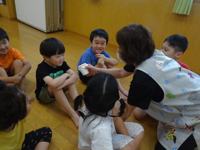 開けてみると、ピーマンやトマトでした。「そういえば、トマトのにおいだね」と改めて先生と一緒に紙コップの中を興味津々にのぞき込む子どもたちです。