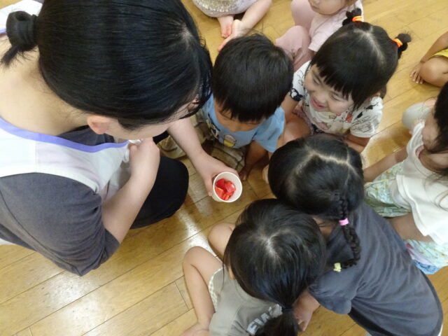 紙コップの中に食材が隠れています。実際に匂いを嗅いで当てるのですが、「うーん・・・むずかしいな・・」でも、全問正解の子どももいて私たち保育士も脱帽!!しました。
