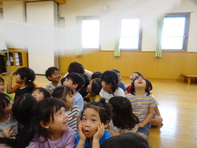 わらべ歌「うえからしたから」を歌いながら、大きな大きなオーガンジーを使って風を感じました。オーガンジーがひらひら揺れるのを見て大喜びでした。