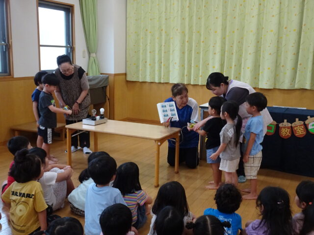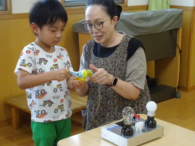 ハンドルを回して実際に電気を発電させました。ピカピカと光る電気に驚きの子どもたちです。