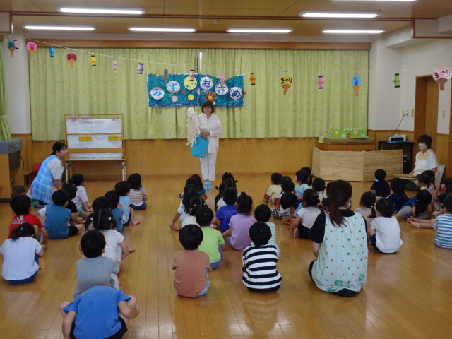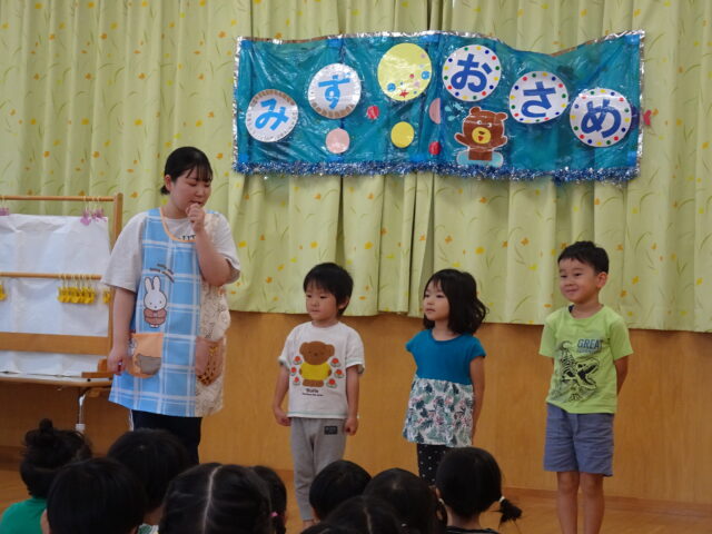 水納めがありました。今年は1歳児クラスから5歳児クラスまでの子どもたちが参加しました。今年の夏の遊びを振り返り、「どんな遊びをしたかな?」「どんな遊びが楽しかったかな?」とインタビューにしっかり答えてくれました。