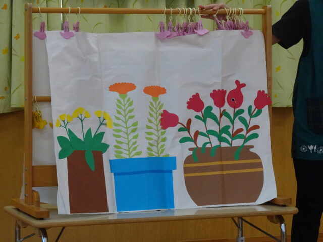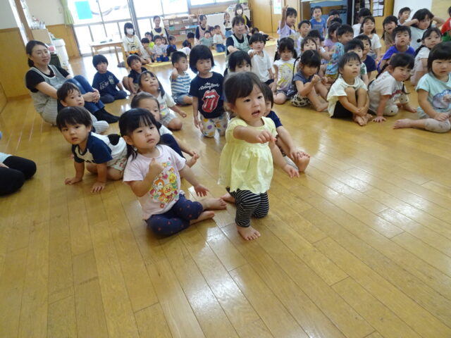 その後は職員の出し物、「きんぎょがにげた」を見ました。大好きな絵本ということもあり、きんぎょを見つけると「あっ!いた!」「あっちにいるよ」と指差しをして教えてくれました。