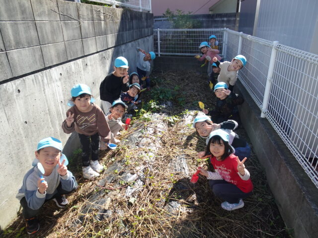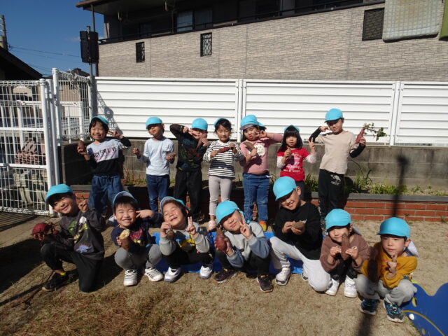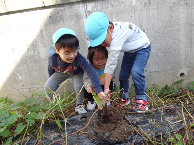 春に植えたさつまいもを収穫しました。スコップで土を掘るとさつまいもがひょっこりと顔を出しましたよ。大小さまざまなお芋がゴロゴロ出てきました。子どもたちも思わず「おおきいねぇ~!!」「やったぁぁ!」と大喜び。収穫したお芋は、後日、焼き芋パーティーで美味しく頂きます。