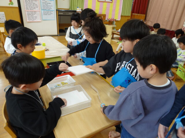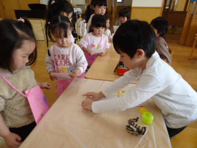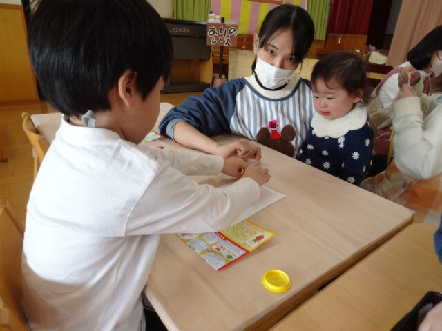 2歳児のお友だちに切手を糊付けしています。優しいですね。