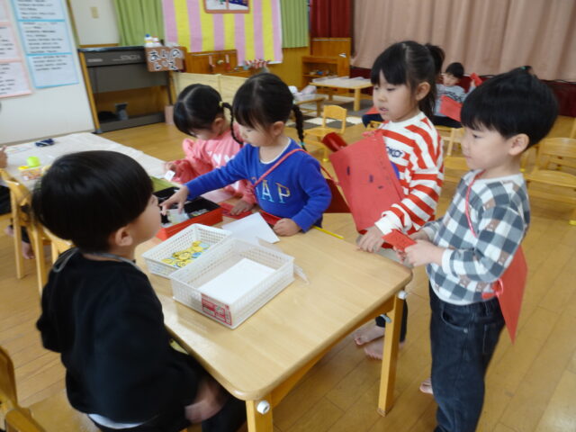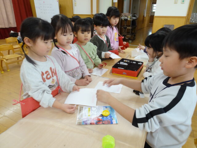 1月8日~22日までひまわり郵便局が開局しました。年長組さんが郵便局員さんです。他のクラスの子どもたちが次々に買いに来ました。「きってとはがきをください」「はいどうぞ」と局員さんとのやりとりを楽しんでいます。