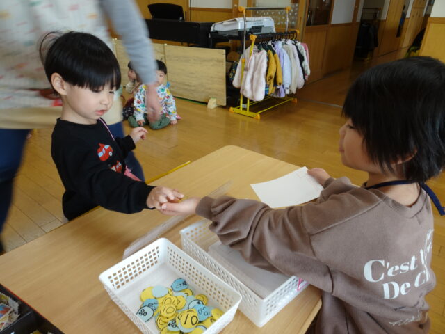 0歳児クラスの子どもたちも、喜んで買いに来てくれました。やりとりがとても微笑ましいですね。