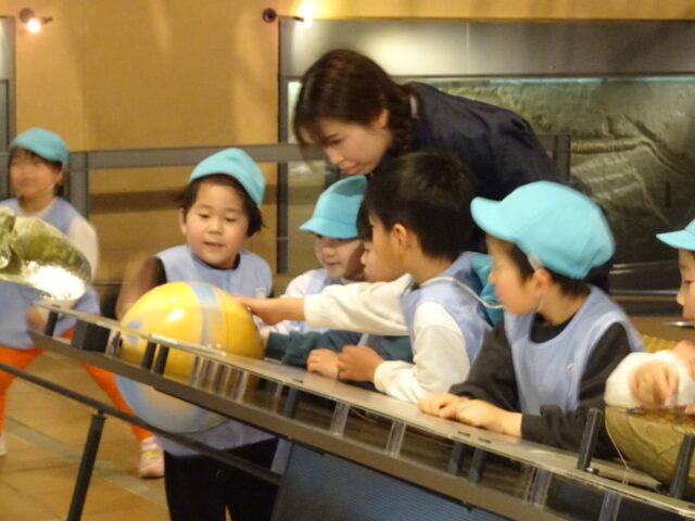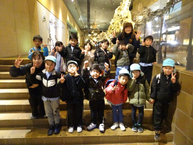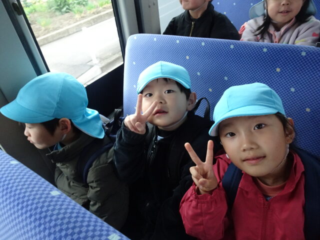 年長児がバスに乗って「いのちのたびはくぶつかん」に行きました。みんなわくわくが止まりません。