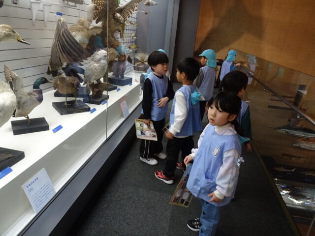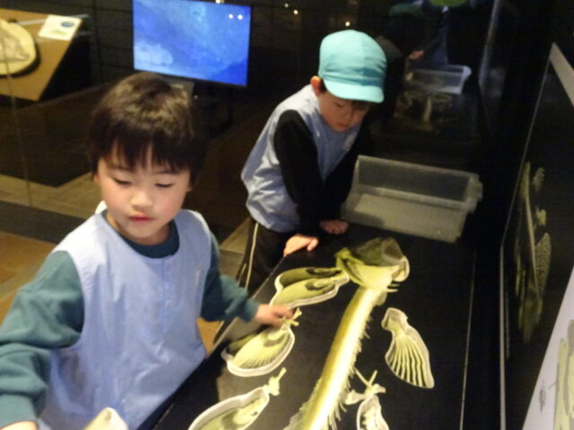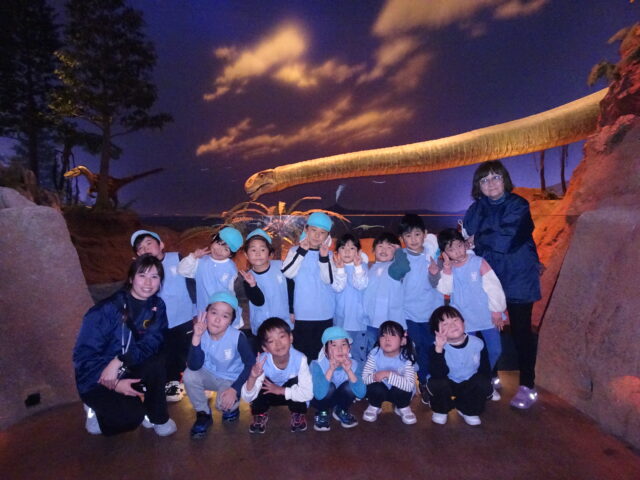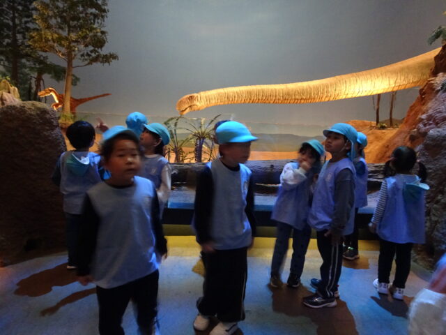 「おおきいねー!」「これなんのきょうりゅうだろう?」「みて!これ、トリケラトプスじゃない?」など友だちや先生とたくさんお話しながら館内を見学しました。