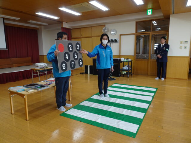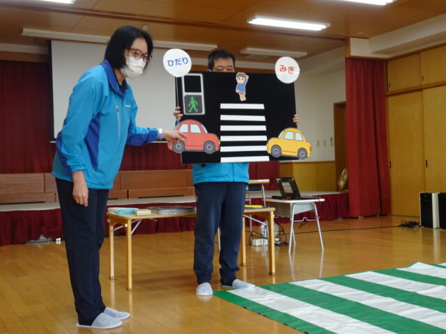 実際に、横断歩道の渡り方を学びました。渡る時も、車の運転手が分かるように、①右見て②左見て③もう一度右を見て④手を挙げて渡りましょう。渡る時は、走らず、サササっと渡りましょう。