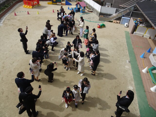 園庭では、他のクラスの先生方や子どもたちから「おめでとう」と紙吹雪でお祝いして頂き、門出をお祝いしました。
