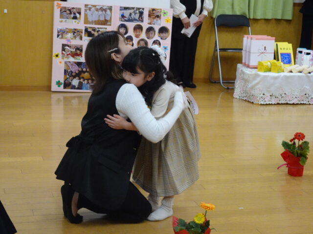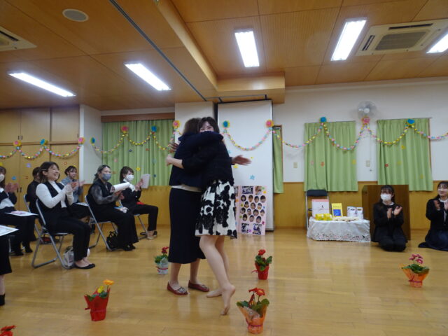 園長先生から担任の先生へ「1年間おつかれさまでした」とハグをしてもらいました。なみだなみだの卒園式が終わりました。
